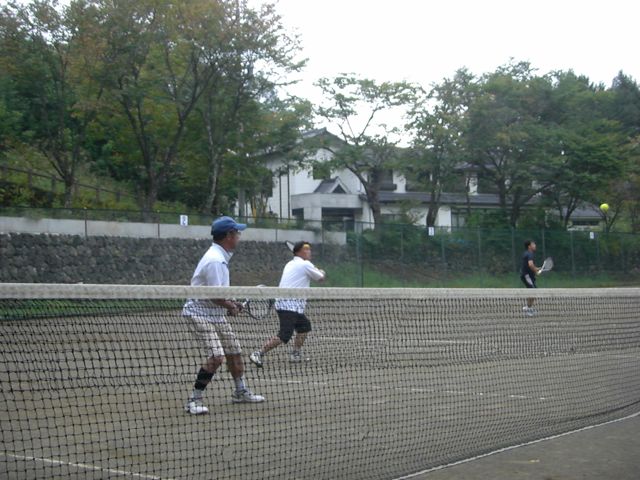 台風の接近でいきなり雨の予報となってしまったので、クレーコートでテニスができるか不安に思いながら出発。今回は車ごとに現地集合にしてしまったので、みんなでワイワイということにはならなかったのは失敗だったかも。うちの車の運転手さんは既にテニススタイルでやる気満々(^^)僕が行く前にはアップもしていたらしい。そんな準備が無駄になるかもしれないほど降っているところもありましたが、着いてみると小雨状態。高峰荘さん自慢のコートは、それくらいでは何ともなかったです。