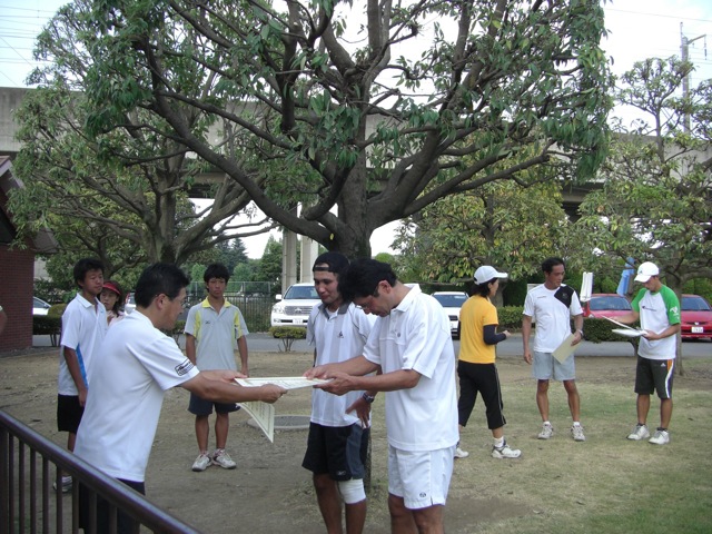 決勝に先立ち、六チームによるトーナメントの抽選が行われた訳ですが… ここで、僕の今日一番のファインプレイ! 高校時代、ラグビーの試合前のジャンケンで17連敗したツキのない僕が、最初にくじを引いてシードの一番をゲット! ベスト4確定です! さらに次に引いたふれんずペアがもう一つのシードの六番を引いてしまい、以降全く楽しみのない抽選になってしまった…。他人事なら空気読め(^^)と言いたいところですが、何しろ当日は暑かった! 試合数はなるべく減らしたいし、休みたいのです。 抽選の結果、僕らの相手は一昨年市民シングルスで負けた中学生のいるペアとふれんずの親子ペアの勝者になりました。去年のリーグ戦でもシングルスでうちのエース格がやられていることもあって、すごく苦手意識があります。ぜひとも親子ペアに頑張っていただきたいけど、厳しいだろうとは思っていました>すいません。 ところが、いざ試合が始まると親子ペアはジュニア達の強打に真っ向勝負! 粘り強いストロークと思い切ったボレーで自由にプレーさせません。親子ペアということで始めから注目されていたけど、この試合では完全にプレーで観客を引きつけていました。 5-3リードで迎えたサービングフォーマッチ。しかも息子さんのサービスで、勝利は目前に迫っていました。ところが、ここでジュニアペアが挽回。ハードヒットをばんばん決めて、4ゲーム連取の逆転劇を演じたのでした(T_T) 破れたもののやりきった充実感を見せた親子ペア。 すごい試合を見せられて、僕らも盛り上がって試合に臨みました! が、若いジュニアペアもさすがに疲れたのか、強打がことごとくアウトになってしまい、僕らが6-1で勝ちました。おいしいとこだけ頂いてしまってすいません。 決勝は唯一ふれんずが入ってなかったグループの勝者です。ふれんずに関係なかったのであまり注目していませんでしたが、優勝候補と思っていたBreakShotさんのペアが負けるほどの実力者です。それでもなんとか勝機を見いだそうとしましたが、相手が一枚も二枚も上手でした。なす術なく1-6で負けました。 最後は負けてしまったものの。初めてテニスの大会で勝ち残れたことがとても嬉しかったですね。常々コーチに言われている「プレーの安定」の大切さが身にしみました。来年度のAクラス出場に向けて、更に精進していきます! 半ば自慢になってるのに(>_<)最後まで見てくれた方、ありがとう! 三位まで表彰されると知って、ちょっと悔しさがにじんでいる親子ペア くじ運よくてごめん! 人気ブログランキングへ PR