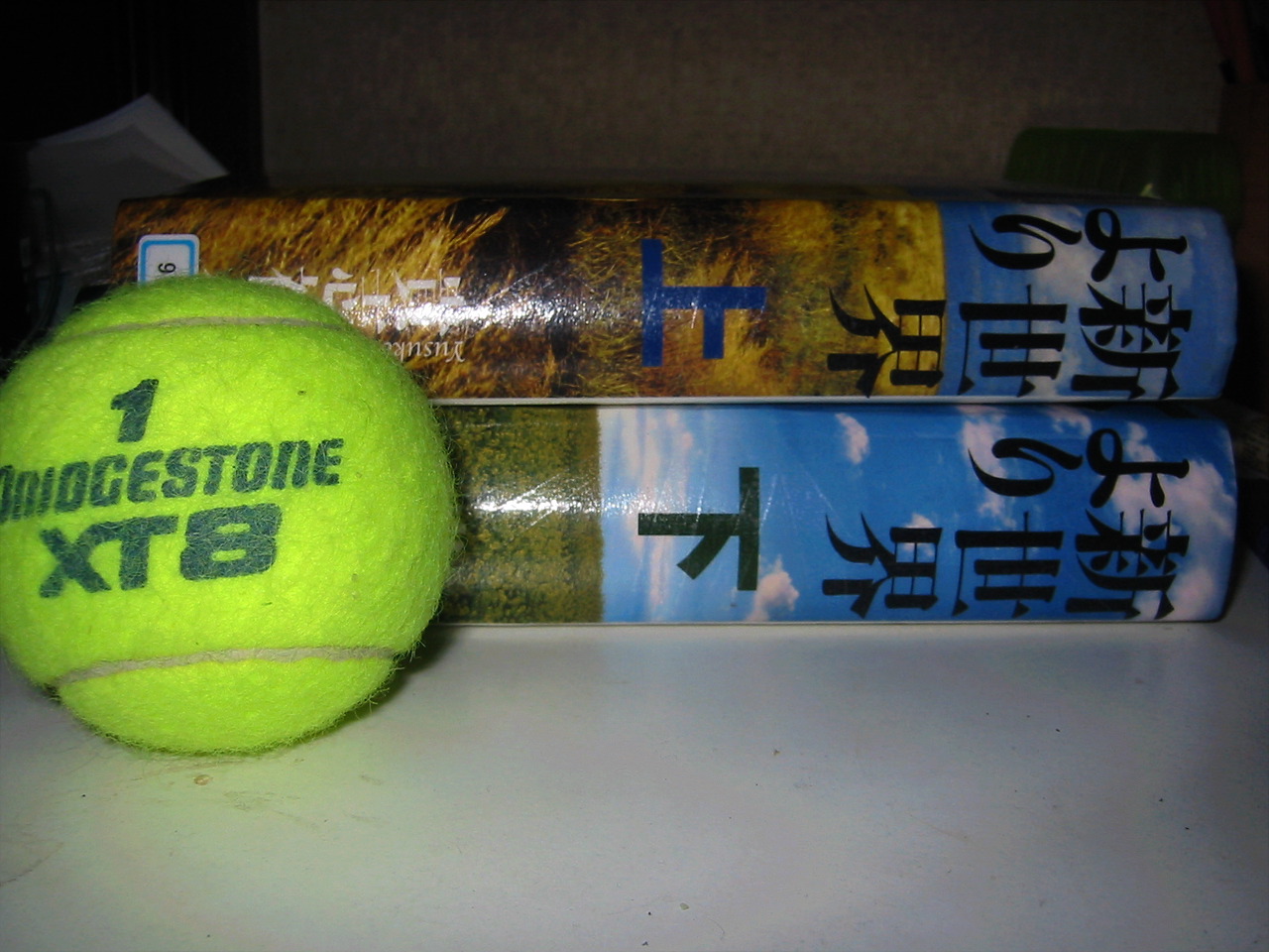 球出しでフォア/バックのストローク。 コーチ登場で、ストローク2本の後短い球をアプローチしてボレ−2本 デュースサイドスタートで三回ずつやってアドサイドに移る。 ここで、所用で帰ってしまったので後は不明(T^T) 最後までやりたかった。 明日の試合は参加メンバーの関係上休みになりそうなので、nPro98を試す。ミニテニスの時点で先日使ったときよりしっくりきてた。かなりパワーアシストがある感じ。18*18のパターンのせいかスピンもよくかかる。グリップを巻き変え、オーバーグリップを巻き、振動止めもつけたのがよかったのかな? ついでにバックハンドのグリップを変えてみる。右手を厚く握る。高い打点で打ちやすくなり、元々得意な低い打点もオーケー。スライスを試し忘れたけど、コンチネンタルに握り変えるか、そのまま打つか悩むところ。 テニスとは全く関係ないけど… よく聞いているポッドキャスト、TBSラジオ「ストリーム」のブックレビューで絶賛されていたので、図書館で予約していた。予約人数はそれほど多くなかったのに、なかなか回ってこないなぁと思っていたら、現物を見て納得! なに? この厚さ! 正直返却日までに読み終えられる気がしなかった。