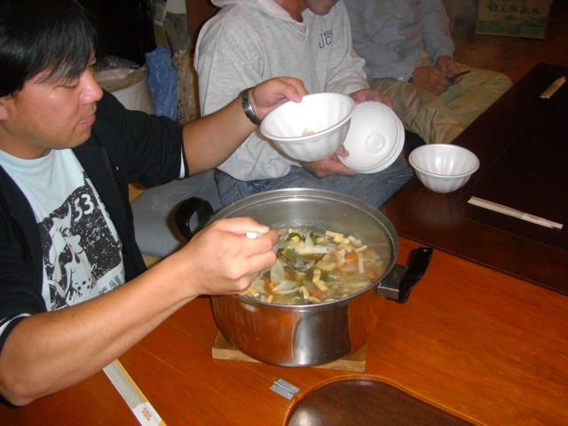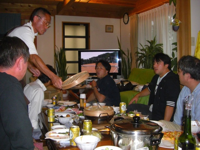 さて、今回の会場はコーチ宅。手料理を振る舞っていただきました。 おでんに始まり、ポテトサラダ、エビシュウマイ、ピザ、煮ぼうと、フルーツポンチといったお手製に加えて、刺身や唐揚げ……。もう喰えません! 食べきられたら末代までの恥という中国式のおもてなしのようでした。 帰る頃には、妊婦のようなおっさんどもが出来上がっておりました。 合宿や市民ダブルスのDVDを見ながら、春合宿を3月頃にと決まったようです。 人気ブログランキングへ